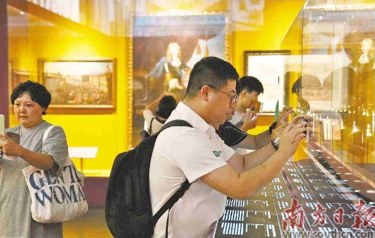 “典雅之冠:18世纪意大利萨沃伊王朝的宫廷生活与艺术”展览现场,观众在展品前拍照。南方日报记者 仇敏业 摄