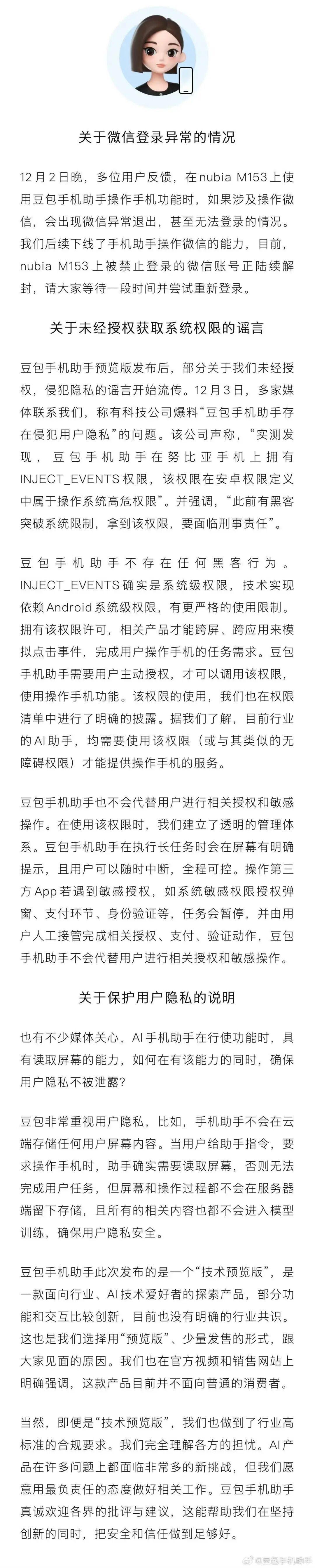 这种由AI全权代理的操作模式,显然触动了App最为敏感的安全神经。面对用户的困惑与外界的猜测,12月3日晚间,豆包官方发布了一份详尽的回应。